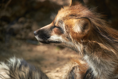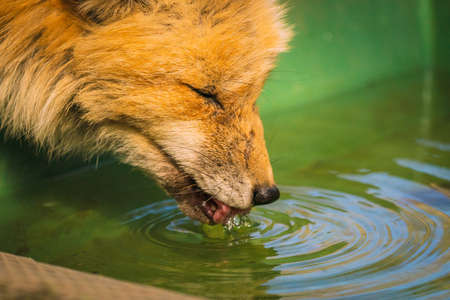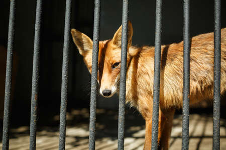 NIKOLAEV, UKRAINE - AUGUST 5, 2018. fox in the zoo, the city zoo, Ukraine. reportage style of photos, with noise and differences in contrast colors
