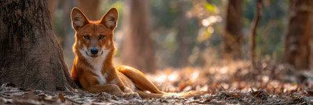 A dhole sits attentively in a sun-drenched forest clearing, surrounded by trees and fallen leaves, showing its keen awareness of the surroundings.