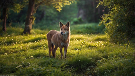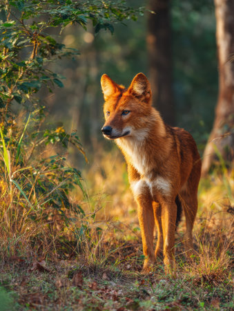 A dhole looks alert in a forest clearing, illuminated by warm sunlight, displaying its vibrant fur as it observes its environment with keen interest.