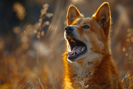 Dhole gazes intently in a warm forest clearing, with golden sunlight illuminating its fur and highlighting the natural beauty of the surrounding trees.