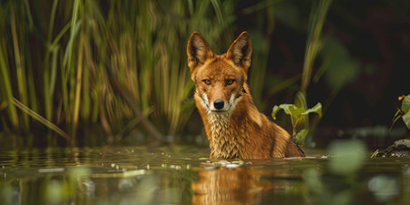 Golden jackal (canis aureus) standing in shallow water and looking at camera. Wildlife in natural habitat