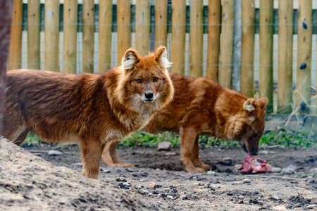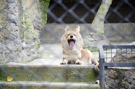 red wolf in the zoo, beast of prey in a cage, red fur.