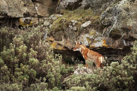 Close up of a rare and endangered Ethiopian wolf (Canis simensis) in the highlands of Bale mountains, Ethiopia.