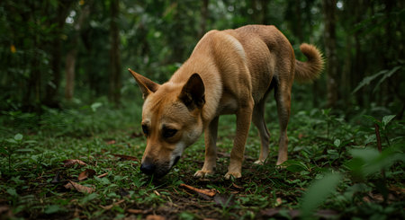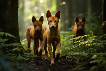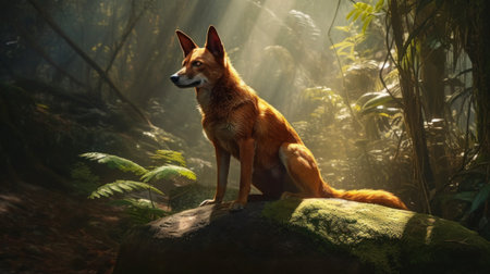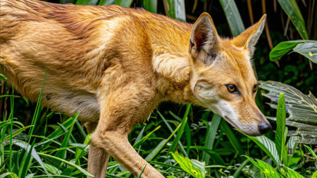 This dhole, an Asiatic wild dog, stands alert amidst lush foliage, showing its keen senses in a serene forest setting. The vibrant fur shines in the gentle light filtering through the trees.