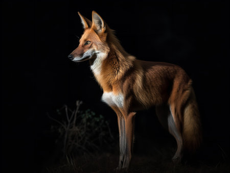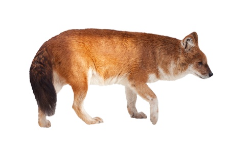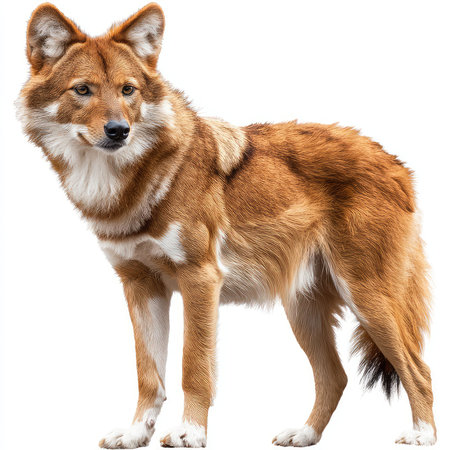 This high-quality image showcases an isolated dhole, highlighting its unique fur patterns and confident stance. Perfect for wildlife enthusiasts and educational content.