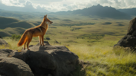 An endangered Ethiopian wolf standing on a rocky outcrop, surveying the vast grasslands of the Bale Mountains.