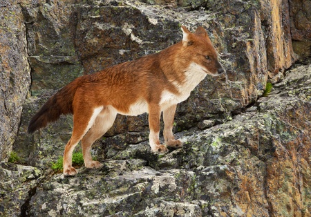Red fox (Vulpes vulpes) standing on a rock in Scotland.