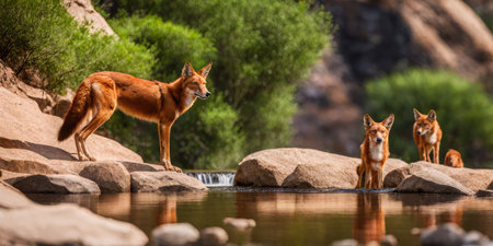 A pack of Dholes, also known as Asiatic wild dogs, in their natural habitat