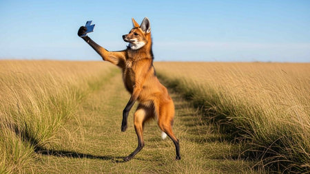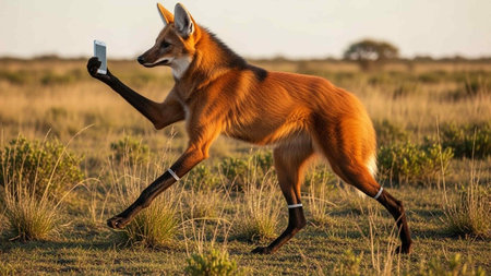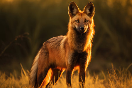 A majestic Maned Wolf stands tall in the golden glow of the South American savannah