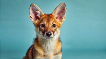 A young red fox with large ears sits looking directly at the camera against a light blue background.