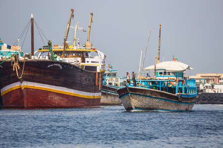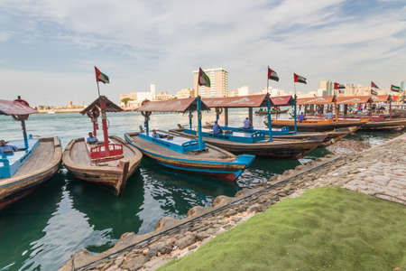 Abra water taxis cross Dubai Creek in front of the old district of Deira, in Dubai, in the United Arab Emirates
