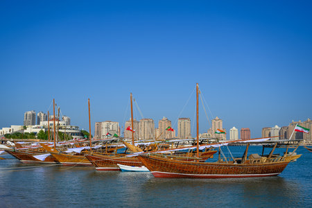 Doha,Qatar- April 24,2022 Traditional boats called Dhows are anchored in the port near the Museum of Islamic Art Park.