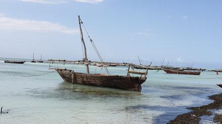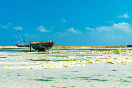 Close up of boat on a beach during large low tide in Nungwi Zanzibar, Tanzania.