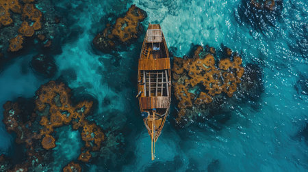 Aerial view of the fishing boats in clear blue water at sunny day in summer. Top view from drone of boat, sandy beach. Indian ocean in Zanzibar, Africa. Landscape with sailboats, clear sea. Seascape