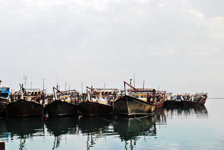 ABU DHABI, UAE - MARCH 27, 2005: Traditional wooden fishing dhows berthed in the Dhow Harbour in Abu Dhabi, the capital city of the UAE.