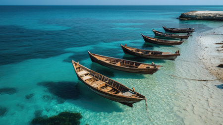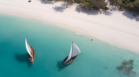 A stunning aerial view of traditional dhow boats floating in the crystal-clear waters of Nungwi Beach, where turquoise meets white sand. AI-generated