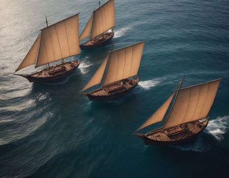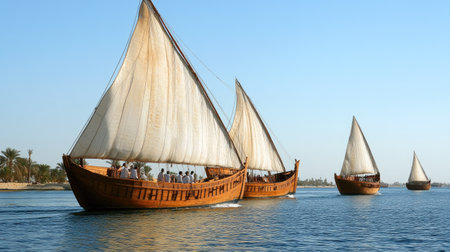 A fleet of dhows sailing together, their wooden structures and large sails a testament to Arabic maritime traditions.