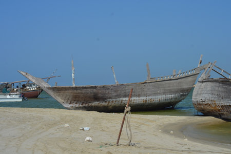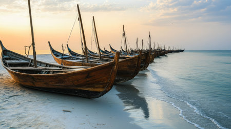 Dhow boats lined up along the coastline, showcasing traditional Arabic craftsmanship, used for transportation and fishing.