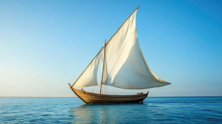 Traditional dhow sailing in open sea, its large sails catching the wind, a classic vessel used for pearl diving and transportation.