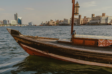 Dubai, UAE - January 6, 2020: Traditional wooden boat docked at Dubai Creek with skyline and Al Fahidi in the background