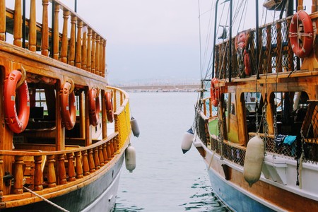 Sailing ships for sea excursions in the city harbor (Antalya, Turkey).