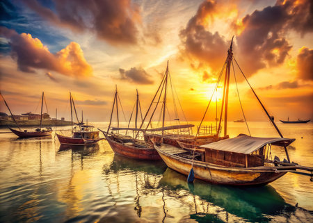 Vintage Zanzibar Dhow Ships: Classic Sailing Vessels at Sunset