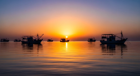 Beautiful sunset over the ocean with fishing boats creating a peaceful and scenic seascape. Golden hour light reflecting on the water.
