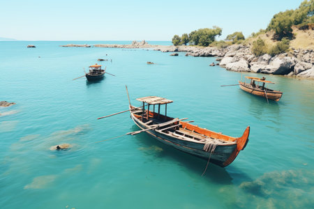 Generative AI : Aerial view of small fishing boats moored off Lake Volvi coastline Mirki Volvi Central Macedonia Greece