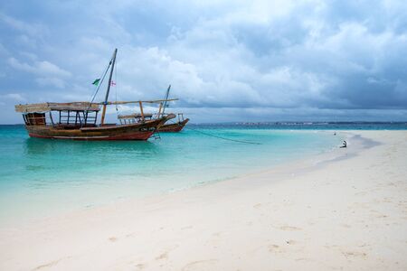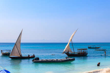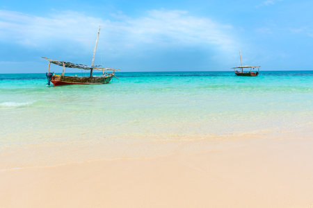 Anchored wooden dhow boats on the amazing turquoise water in the Indian ocean Zanzibar, Tanzania.