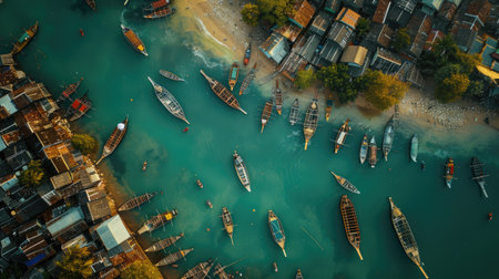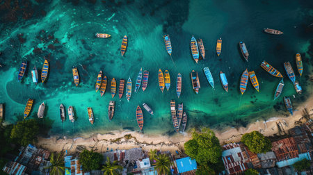 Captivating aerial view of colorful boats anchored in clear tropical waters, surrounded by lush greenery and vibrant coastline. Ideal for travel and nature themes.
