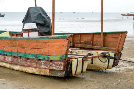 TANJI, THE GAMBIA - NOVEMBER 21, 2019: Traditional fishing boats in Tanji. Fishing village. Gambia, West Africa.