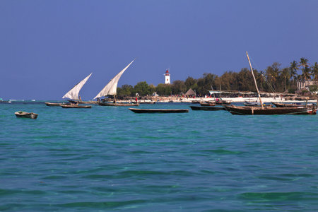 Nungwi, Zanzibar, Tanzania - September 16, 2021: View of tropical sandy Nungwi beach and traditional wooden dhow boats in the Indian ocean on Zanzibar, Tanzania