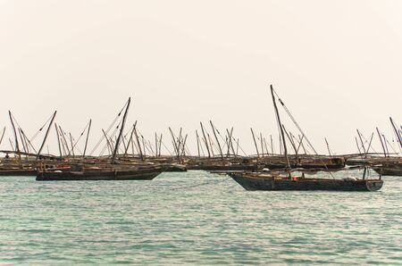Traditional fishing dhows laden with gargours, or fish traps, near Sharjah Bridge in Sharjah in the United Arab Emirates.