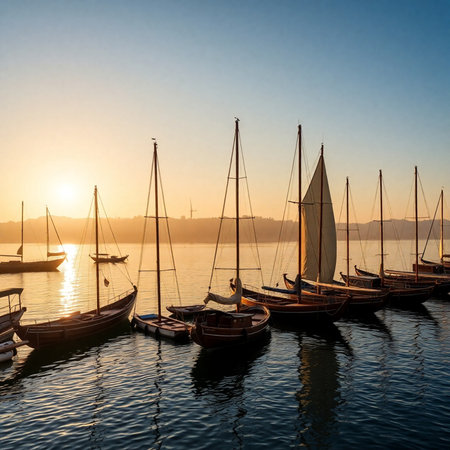 A tranquil sunset paints the sky with warm hues above silhouetted fishing boats resting on calm waters, evoking peace and natural beauty in this serene scene.