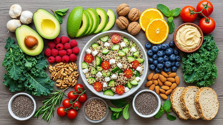 A vibrant flat lay of a healthy quinoa salad bowl surrounded by fresh fruits, vegetables, nuts, seeds, and whole wheat bread.