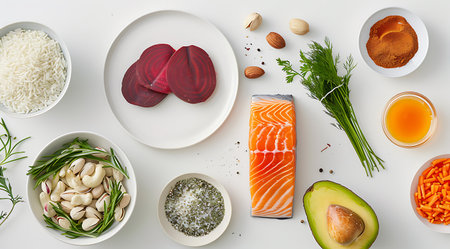 A vibrant assortment of nutritious foods includes various fruits, vegetables, grains, nuts, and protein sources. The composition showcases a variety of colors and textures against a neutral background with natural light. Suitable for commercial applications such as health, wellness, or dietary content.