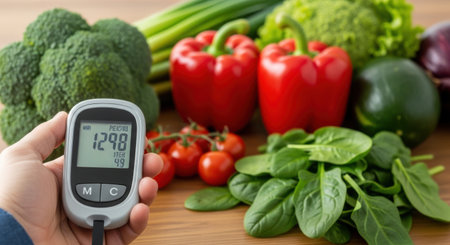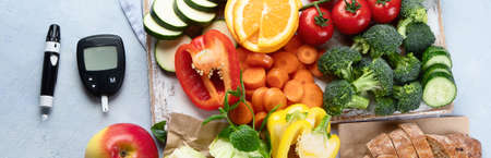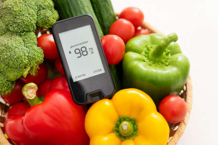 Glucometer with fresh vegetables. Healthy food, diet and nutrition