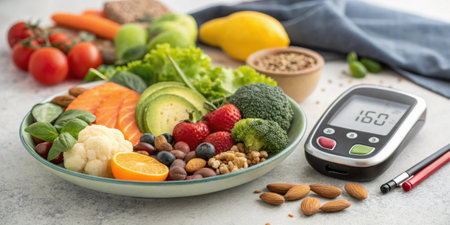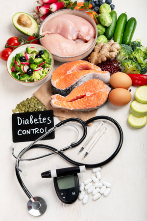 Diabetes composition with healthy food, and glucose measuring equipment on desk with copy space in the middle for text promotio