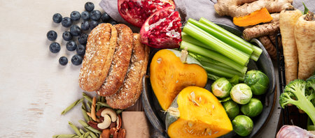 Low glycemic healthy foods for diabetic diet. Food with foods high in vitamins, minerals, antioxidants, smart carbohydrates. Top view. Panorama, banner