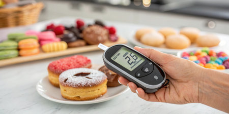 Blood Glucose Meter A hand holding a sleek glucose meter displaying a high reading with a blurred kitchen background filled with various highimpact foods like pastries and candy..