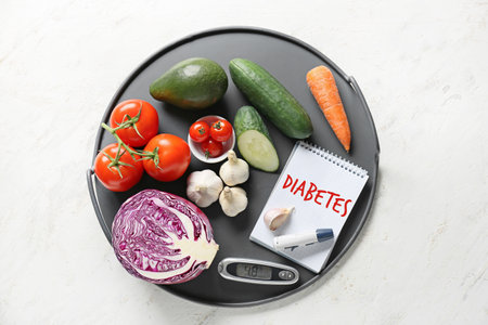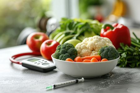 diabetic measurement tools and fresh vegetable on table