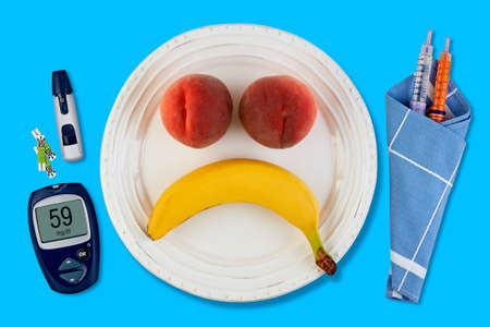 raw vegetables and fruits with blood glucose meter and insulin syringe, diabetes healthy diet concept