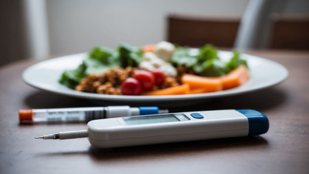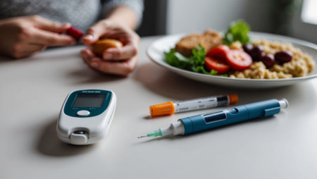 diabetic measurement tools and insulin pen and healthy food on table