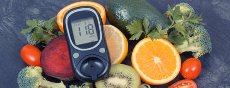 Glucose meter for checking sugar level and fresh ripe fruits with vegetables containing healthy minerals and vitamins