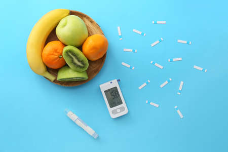 Fruits, glucometer and lancet pen on color background. Diabetes concept