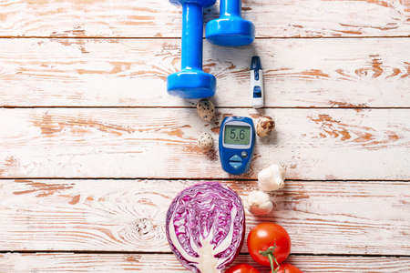 Vegetables, dumbbells, lancet pen and glucometer on white wooden background. Diabetes concept