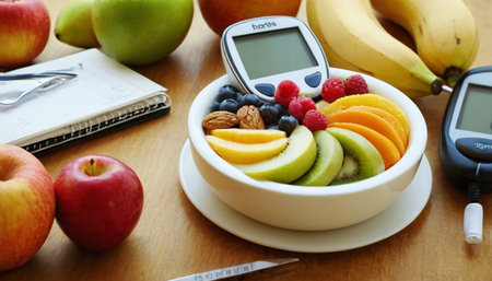 Glucose meter with fresh fruits and nuts displaying healthy lifestyle concept of nutrition, dieting, and wellness with berries, apples, almonds, and walnuts, white background, Banner, copy space.