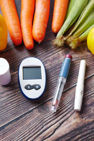Diabetic measurement tools and insulin pen and healthy food on table