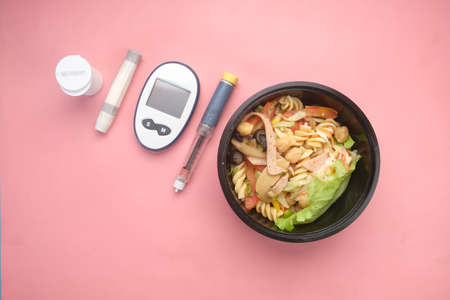diabetic measurement tools and insulin pen and healthy food on pink