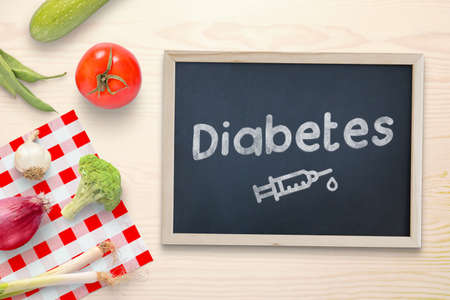 Diabetes written on a chalkboard with a drawing of an insulin injection, in addition to healthy food, vegetables. Top view, flat lay composition
